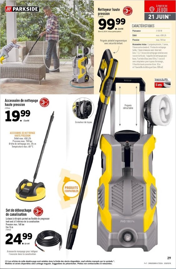 Dans le catalogue Lidl du 20 au 26.06, que pensez-vous du nettoyeur haute pression Parkside (max. 150 bar - 2100 Watt - débit max.450 L/min) à 99,99 € (Seule).