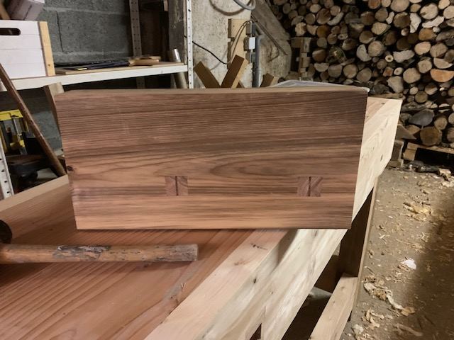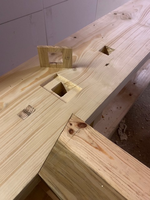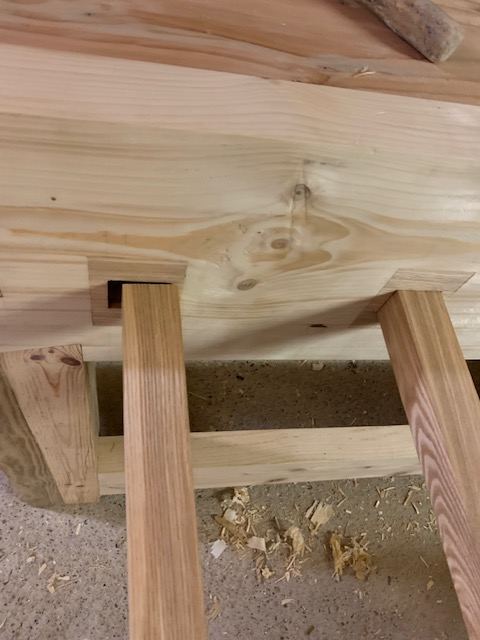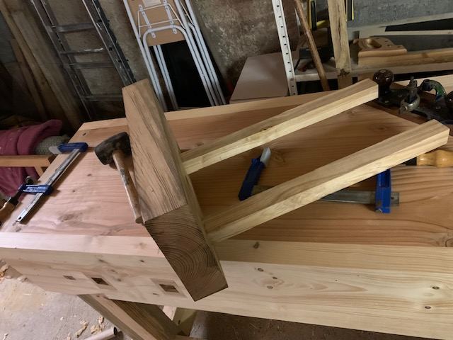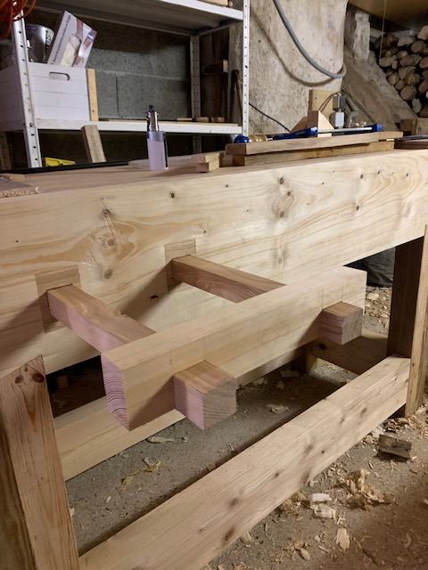 Petite avancée aujourd’hui: j’ai fait les entailles pour insérer deux pièces de frêne sur le tablier. Les mortaises n’étaient pas assez précises et j’ai préféré un insert en bois plus dur pour garantir une plus grande longévité.