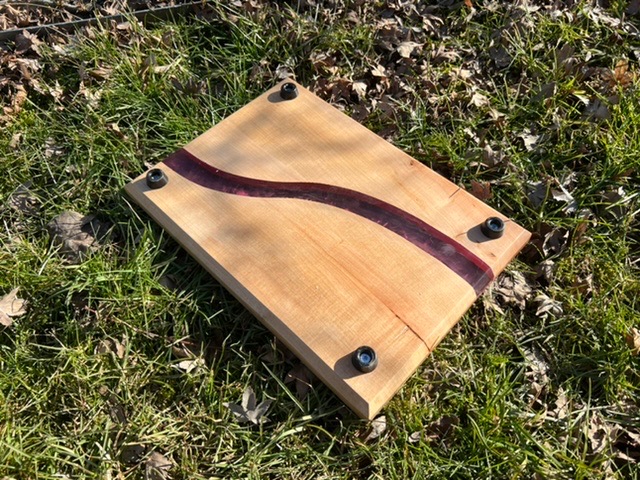 Plateau de service en poirier avec une coulée d’epoxy rose.