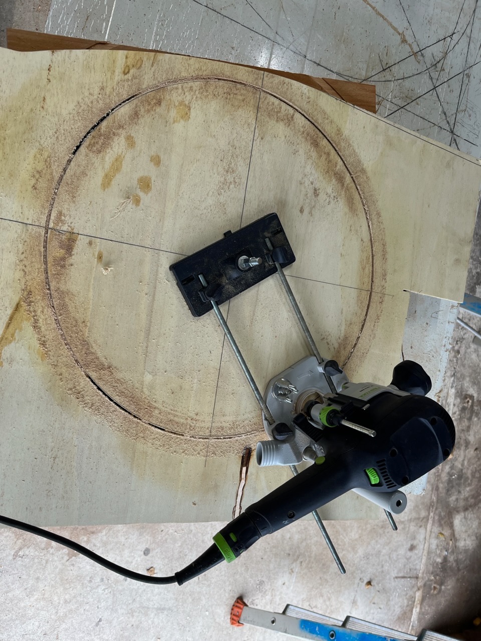 J’ai coller des morceaux de bois de 40mm pars 40mm en forme de cercle grossier (polygone), j’ai installé une entretoises à l’axe de mon cerclage grossier , sur lequel j’ai installé ma fonceuse , ensuite j’ai défoncé en tournant.