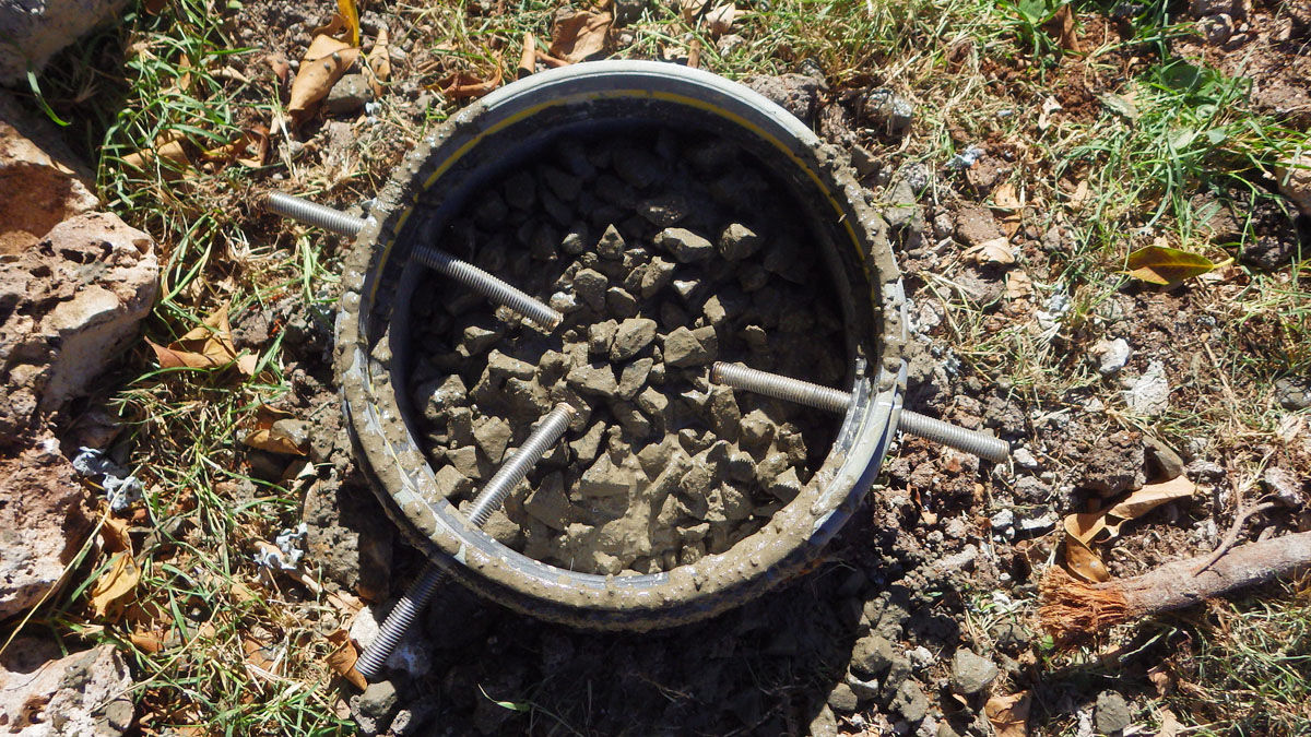 Dernières photos, ça a l'air de rien mais le béton est coulé dans les poteaux (9 brouettes) et les tiges filetées réglées en hauteur et en position.