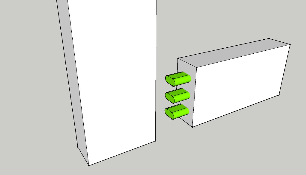 Maintenant que j'ai plus ou moins arrêté les plans de mon établi je commence à me poser quelques questions concernant l'assemblage de mon ossature en bois. Disposant de la petite domino de festool, pourriez-vous me dire lesquels des deux assemblages ci-dessous serait le plus approprié ? (la pièce fait une section de 40*90mm et les dominos font 10mm d'épaisseur par 24 environ de largeur par 50mm de profondeur)