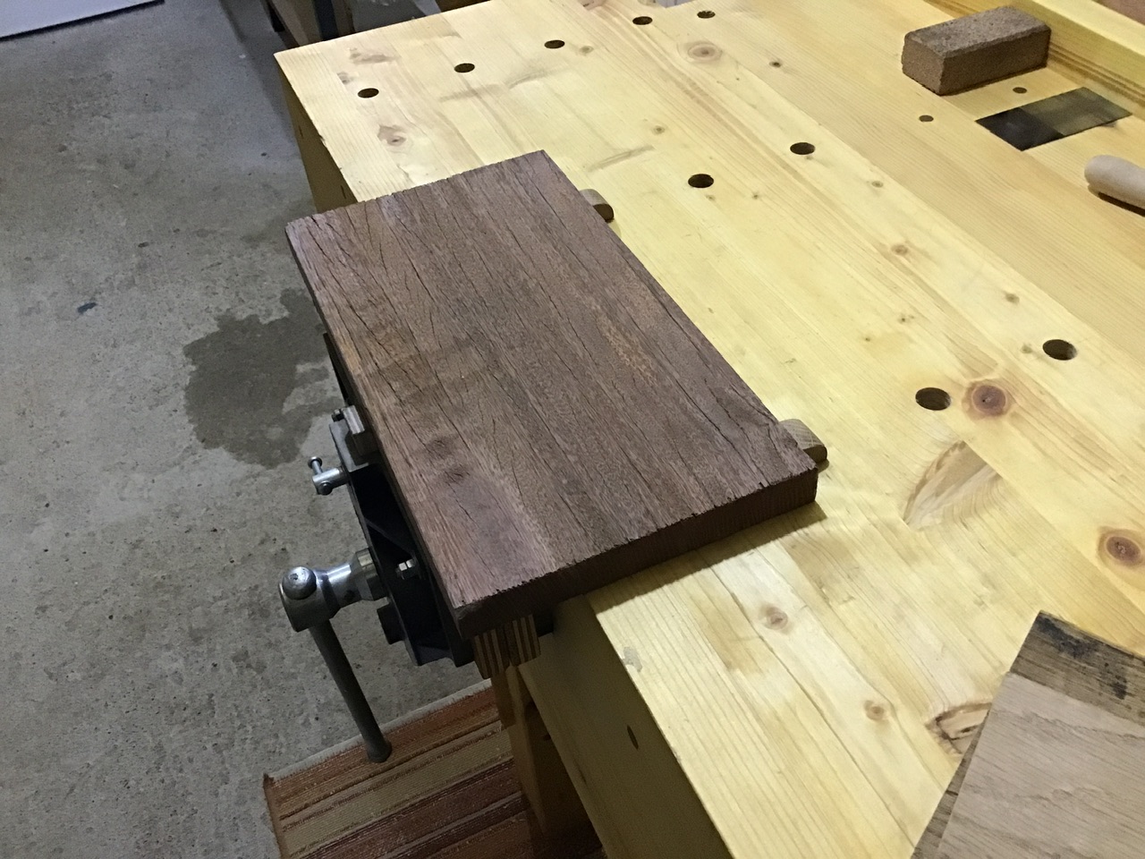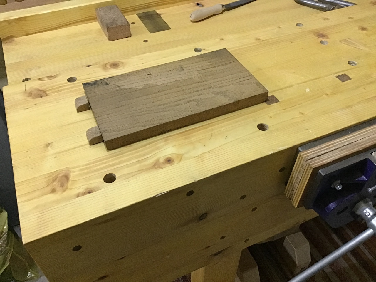 Et une butée en bout (j’ai fixé un bloc de chêne sous l’établi, dans lequel vient le valet. Comme ça je peux mettre la butée à la hauteur voulue. C’est rapide et ça tient très bien.