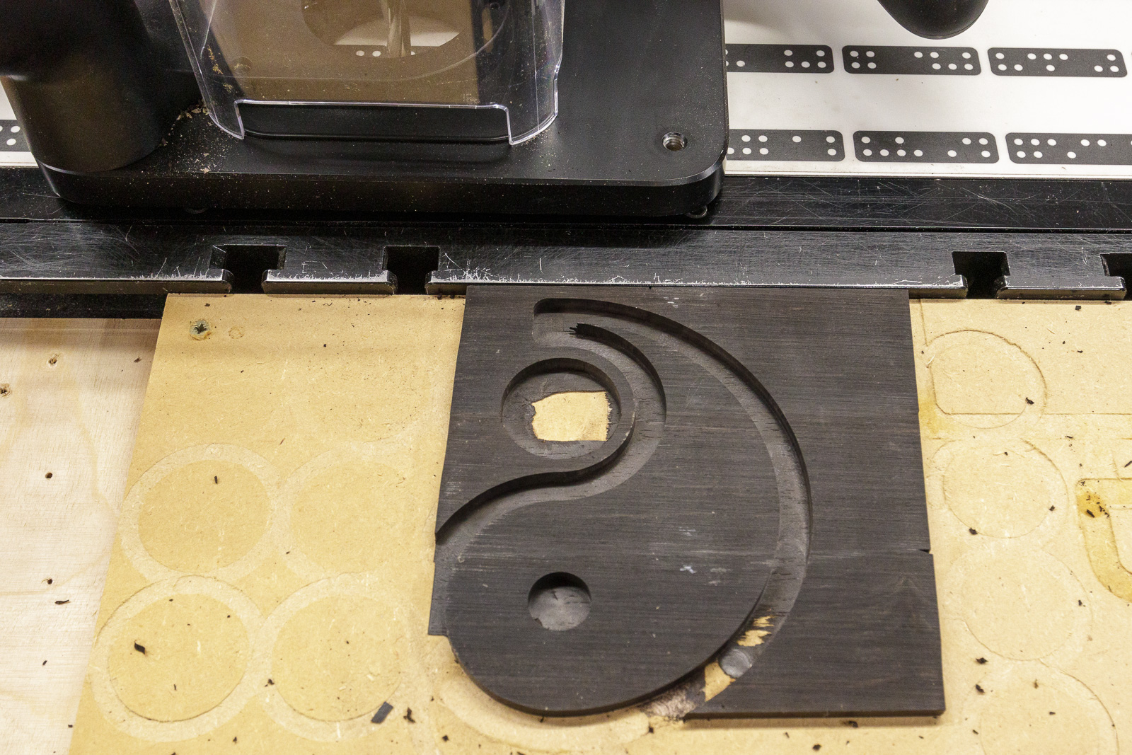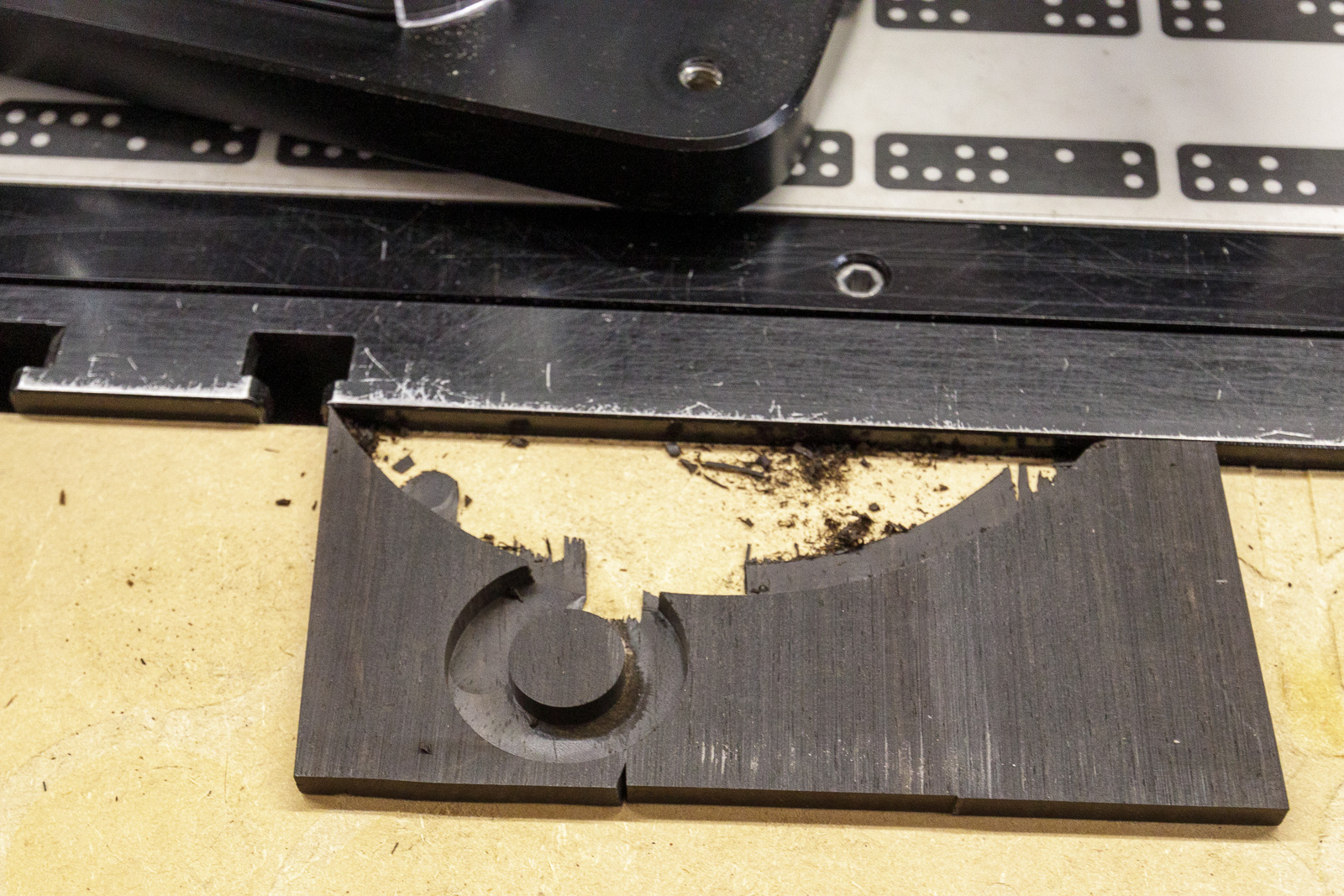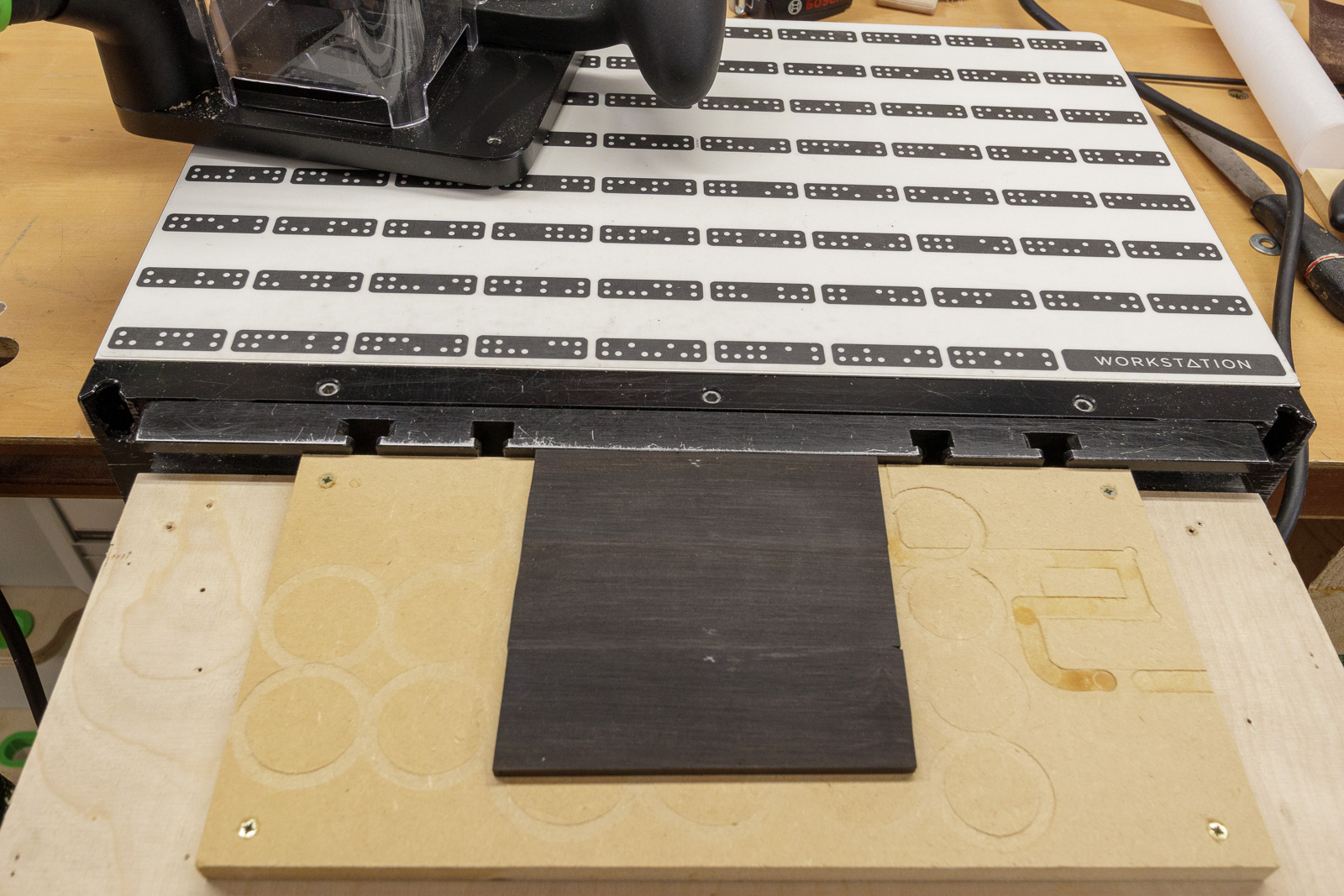 Je passe à la découpe de l'ébène, en fixant ma plaquette sur la workstation de la Shaper Origin avec du double face.