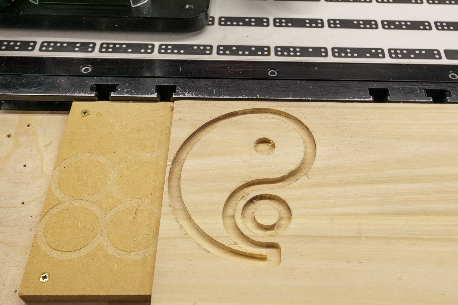 Et voici le résultat de la découpe. Comme vous pouvez le remarquer le petit cercle a disparu. C'est de ma faute, j'avais placé le double face au mauvais endroit, il a été aspiré pendant la découpe