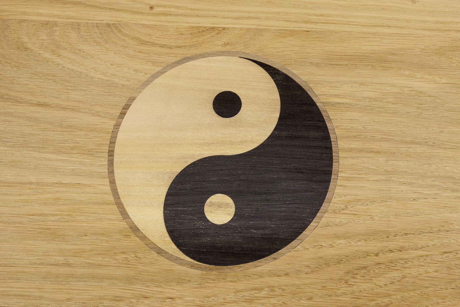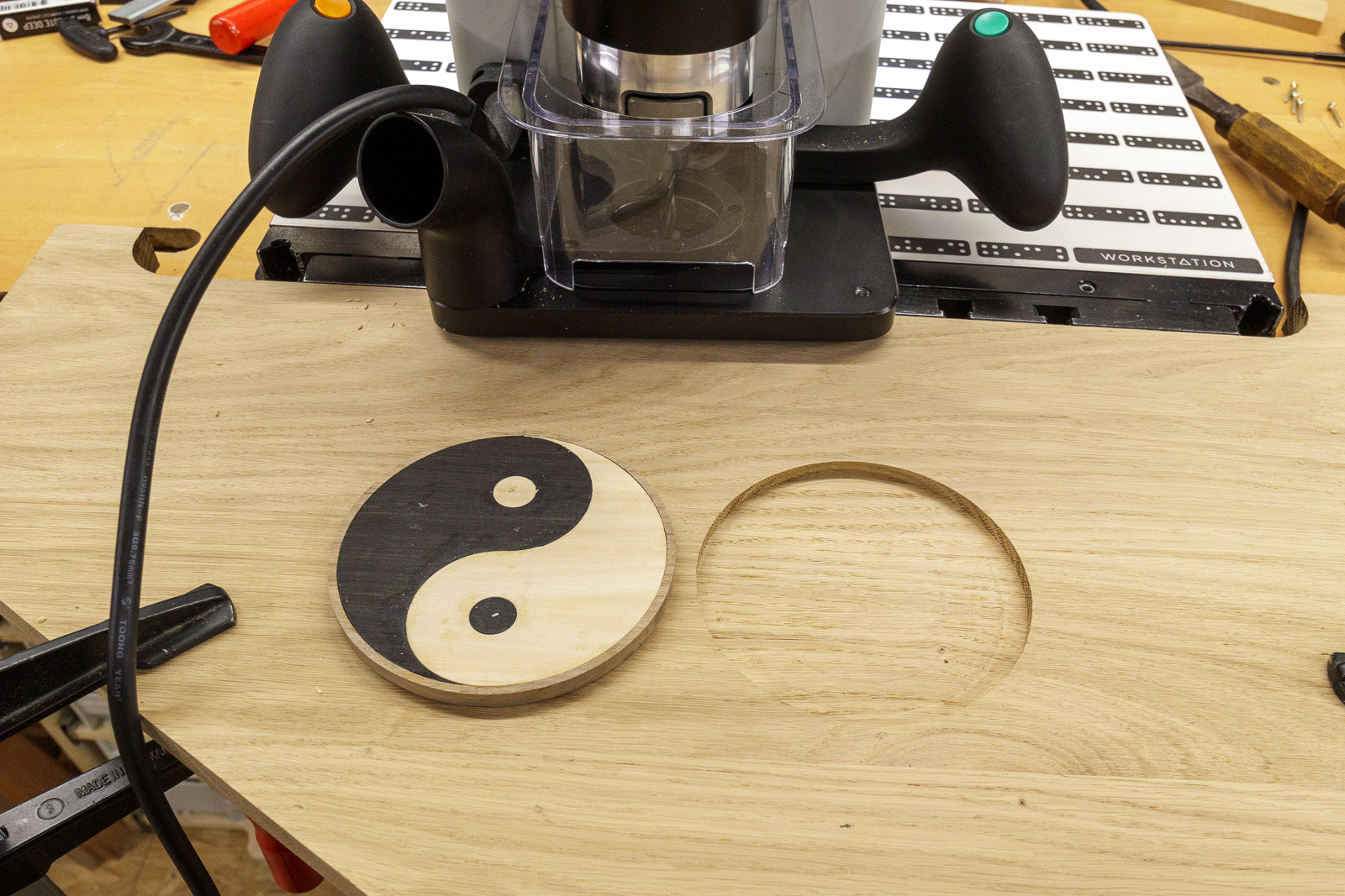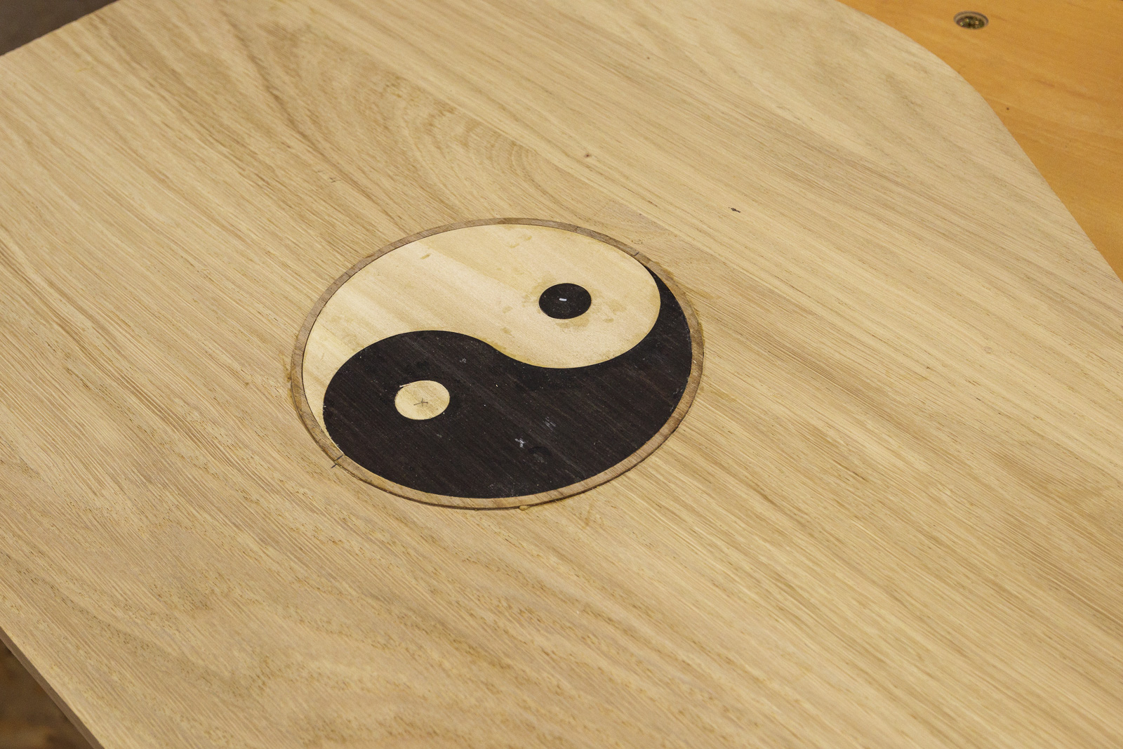 Le cercle qui entoure le motif est d'une seule pièce. C'est un gros disque, plus épais que le motif (7 mm pour le disque, 5 mm pour le motif), et il est évidé en son centre pour recevoir les pièces de tilleul et d'ébène.