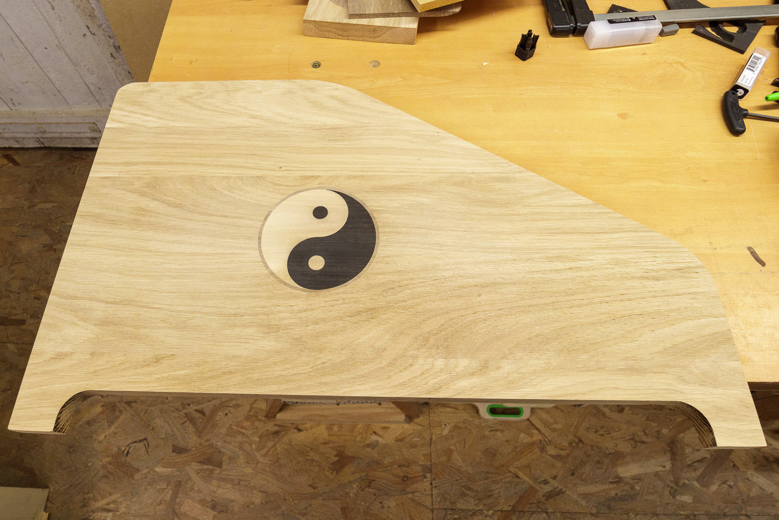 Paradoxalement, l'incrustation s'est déroulée sans encombres, mais c'est le ponçage qui a posé problème. En effet, la poussière noire de l'ébène laissait des traces sur le tilleul très clair. Heureusement le racloir m'a permis de sauver la situation.