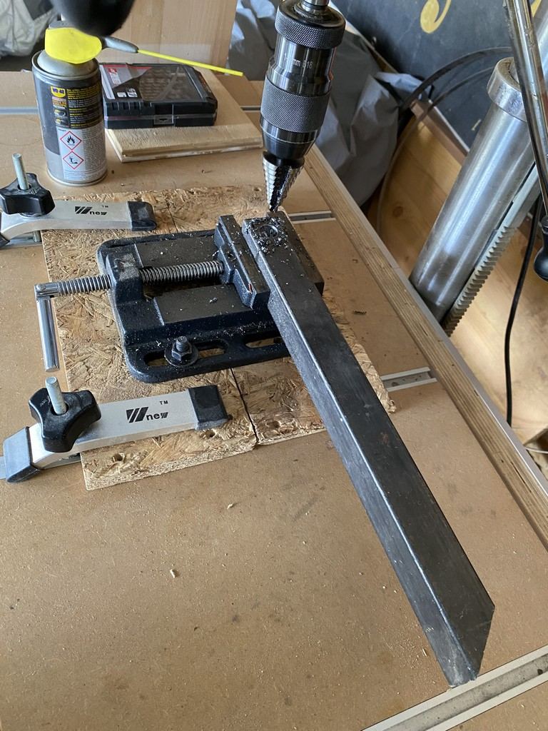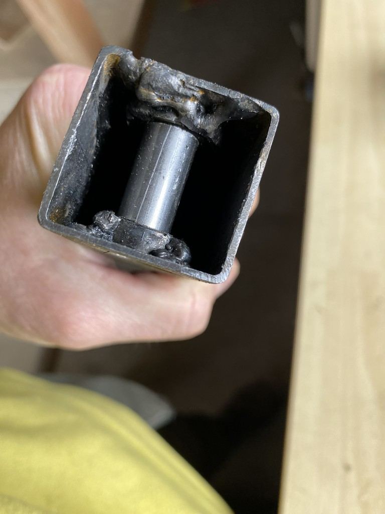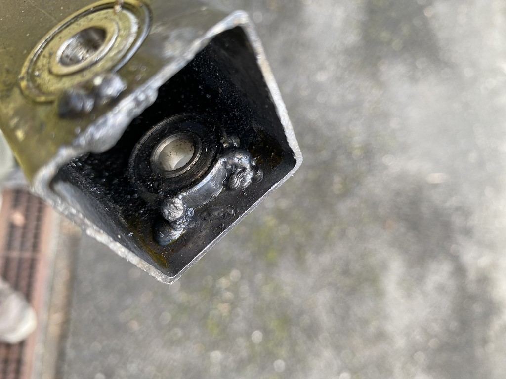 Je récupère des chutes en métal pour y incorporer des roulements : Les soudures sont plus faciles qu'a faire sans bloquer le roulement a cause de la chaleur ... donc c'est pas propre, mais ça tient : Une petite entretoise : et je le fixe sur le montant :