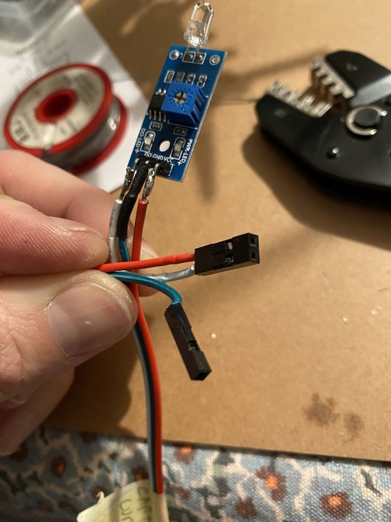 fixation d'un capteur de porte fermée placé en dessous de la rampe : sur tous les différents capteurs j'ai réalisé la mise en place de connecteur Dupont sertis soudés: et pour le capteur de luminosité qui doit être capable de voir la lumière du soleil sans être en contact avec l'humidité, j'ai récupéré une espèce d'éprouvette en plastique que j'ai retravaillé légèrement au décapeur thermique pour que le capteur rentre bien :