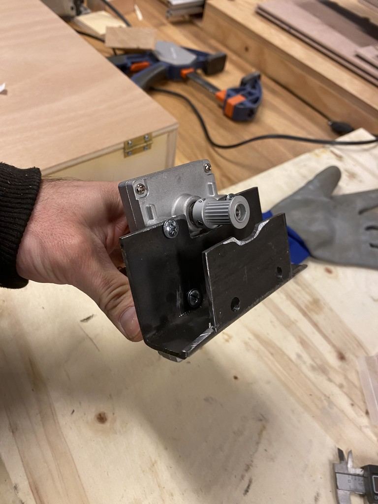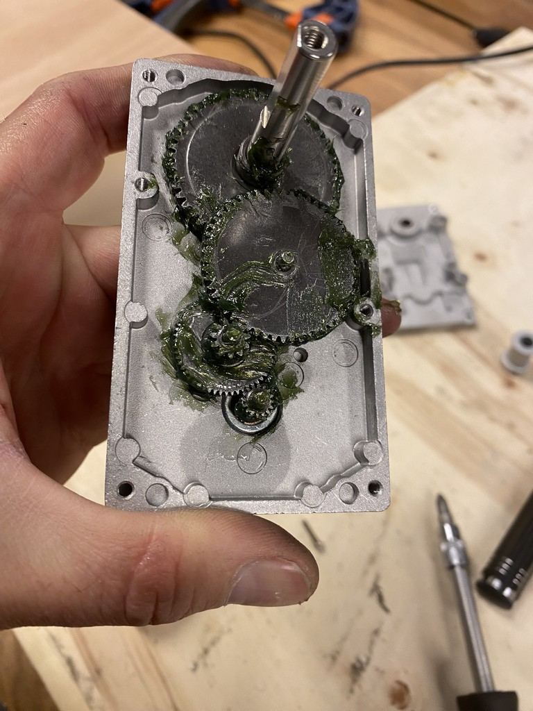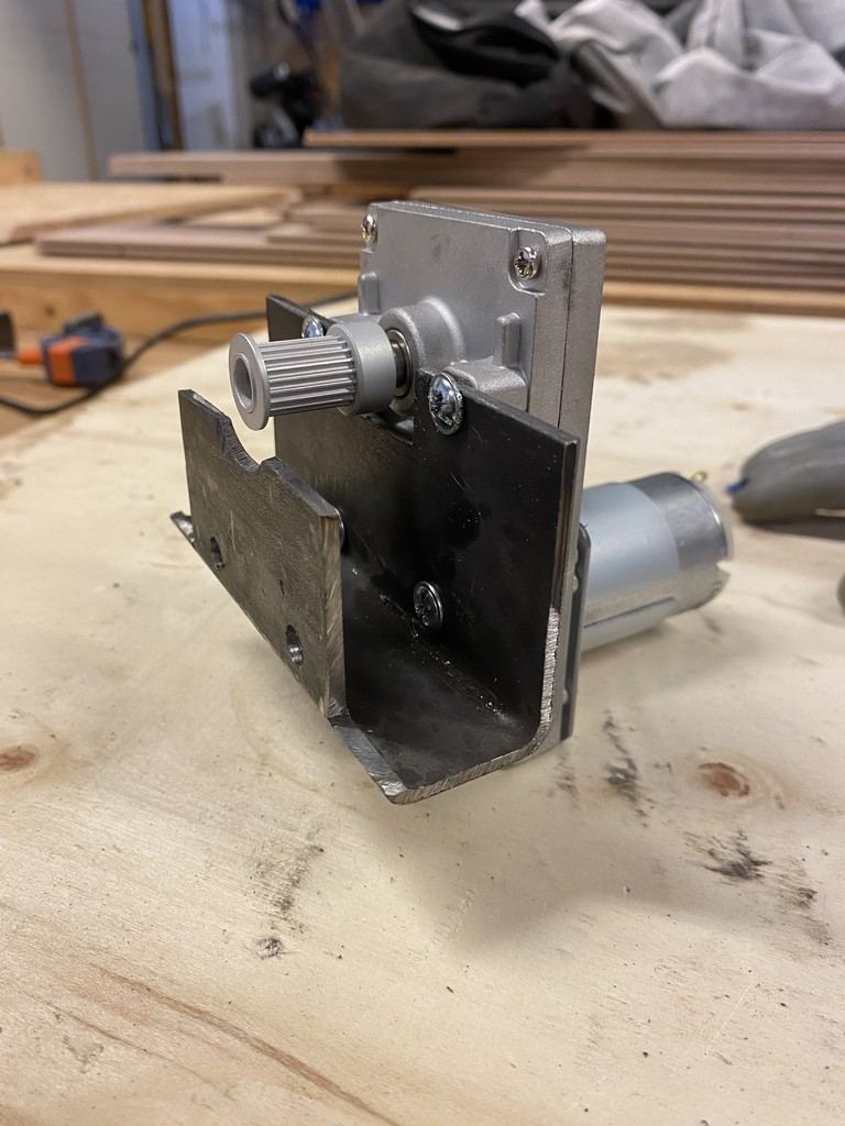 Alors j'ai bien reçu le nouveau moteur et son motoréducteur qui semble être de bien meilleur facture. Je lui i fabriqué un support avec une chute de métal : j'en ai profité pour bien graissé tous les engrenages : et enfin l'ai positionné :