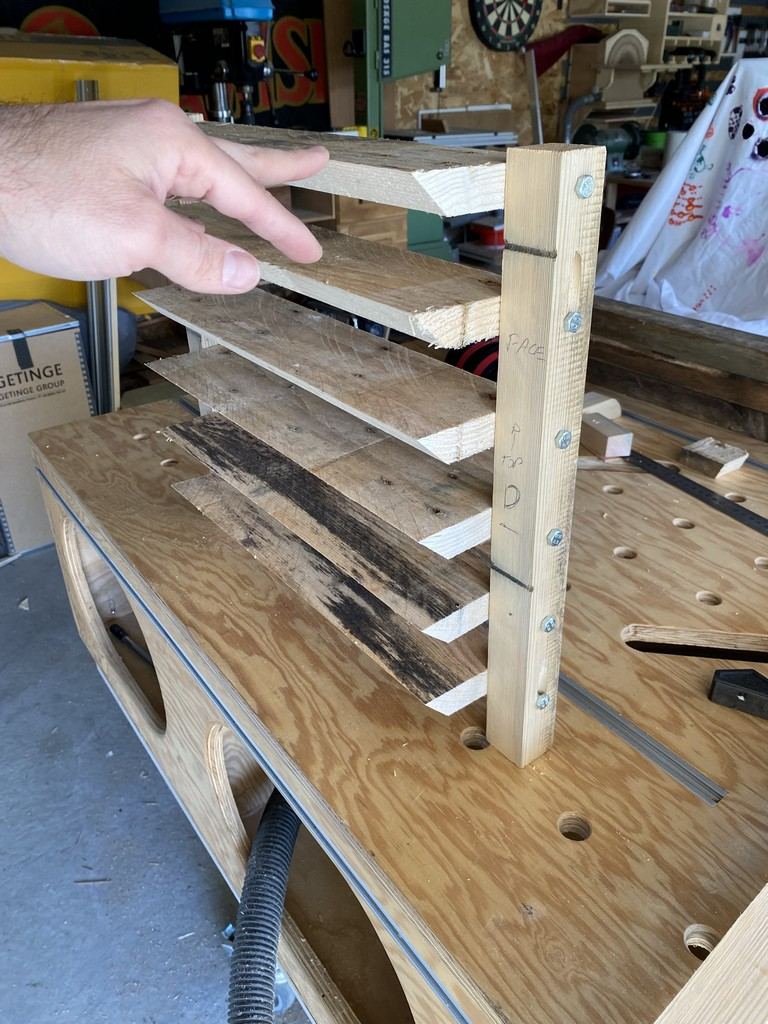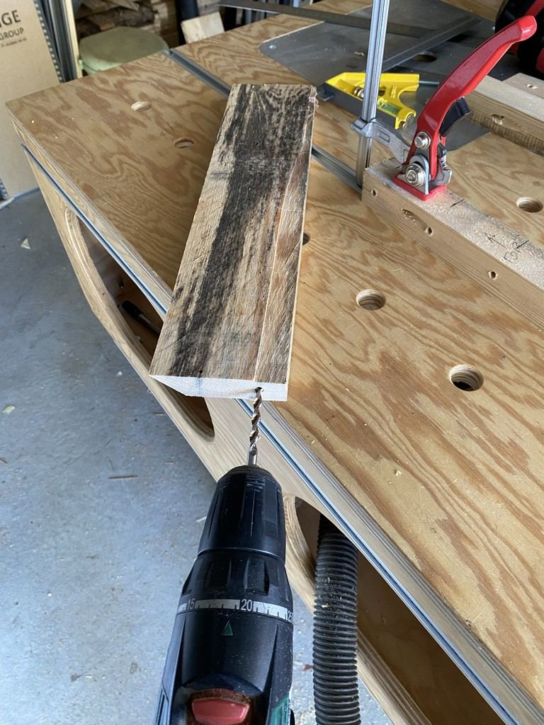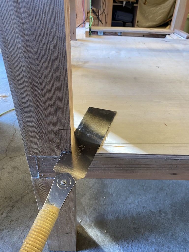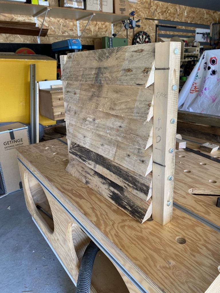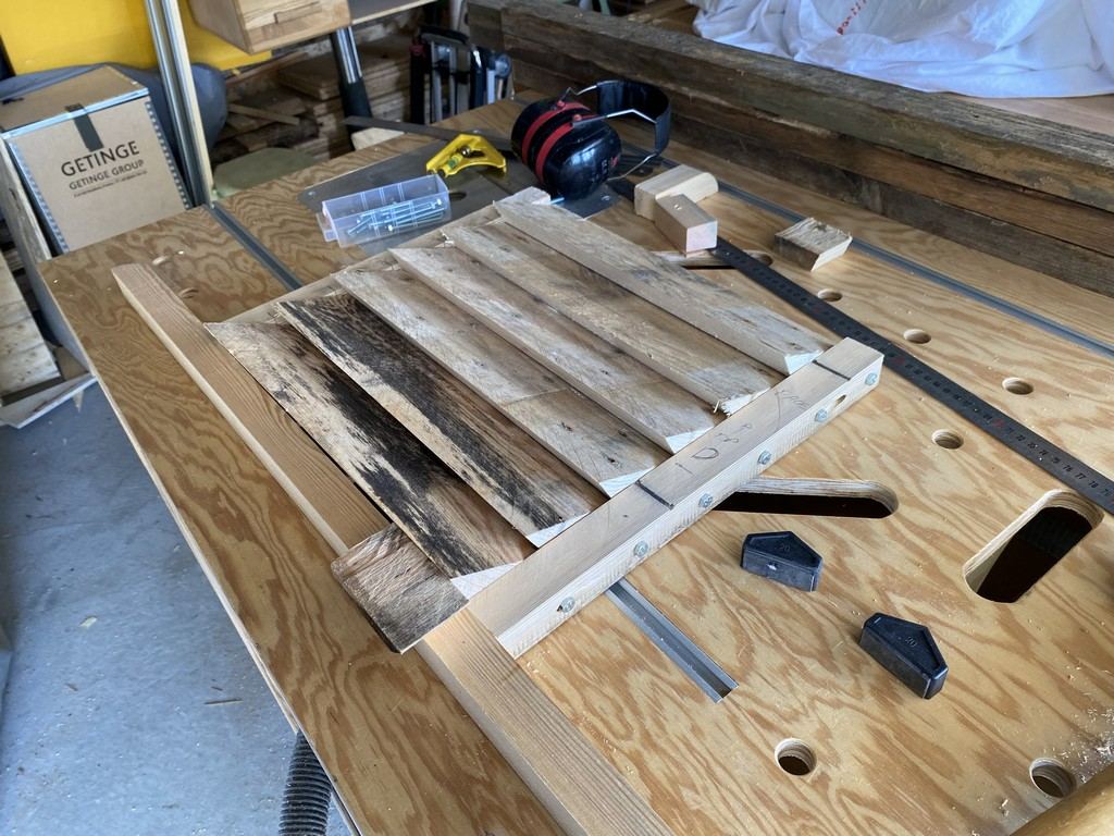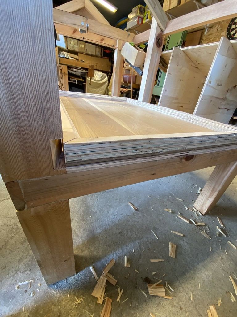 et concernant son encadrement, il sera fait avec du contre plaqué de palette de récup également : egalement pour faciliter sa remise en place, j'ai biseauté les pieds et positionné des petites roulettes (surtout pour que le bac n'enlève pas la terre de diatomée)