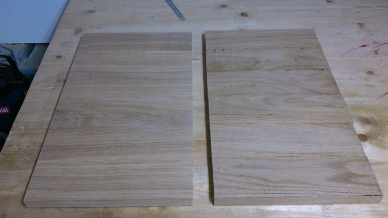 Le panneau de gauche à eu droit à un premier ponçage au grain 80 "pour voir"... Je suis assez content du résultat, pas de jour (pour l'instant) et du désafleur sur une seule face. Comme je suis nul pour repérer le sens du fil, ben y'a plus qu'à prier... J'ai essayé de faire attention à bien alterner le sens des cernes lors de l'établissement du panneau (il y a 6 planche par panneaux).