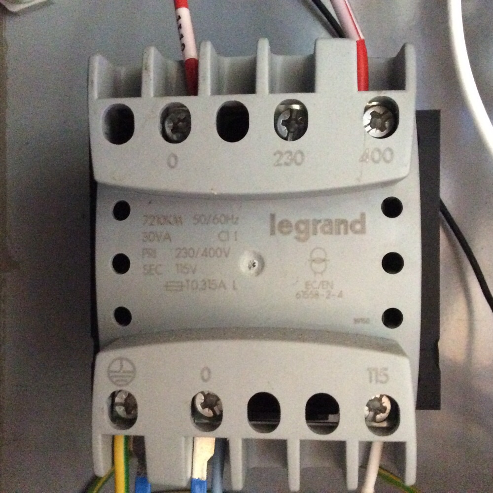 Je viens d'ouvrir le boitier machine contenant les branchements et je suis tombé sur le transfo ci dessous. Je me dit super! Y'a qu'a inverser le 400 sur le 230! Mais non ca suffit pas: a la mise en route un clac et plus de jus, sur le variateur "Er OCr"...