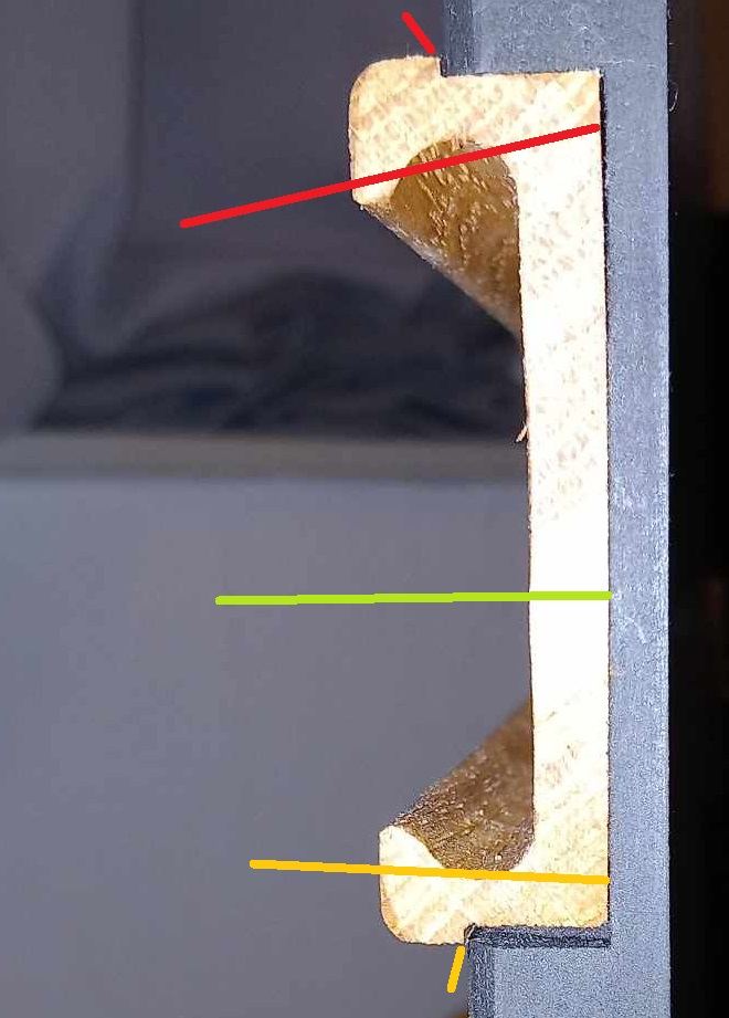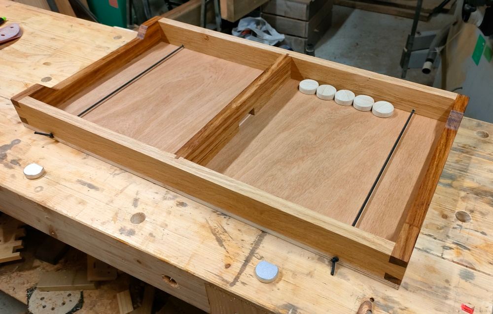 Je suis content parce qu'au départ, je n'avais pas fait le décroché, et une fois terminé et essayé, je trouvais que la hauteur des bords de 4.8cm gênait au tir du palet. J'avais un peu les boules de tailler le décroché une fois tout terminé, mais avec le gabarit et une fraise à copier, ça s'est bien passé, et ça lui donne un style sympa. Je regrette de n'avoir pas pris le temps d'intégrer le contre-plaqué dans une feuillure, mais c'est pour offrir, et j'étais pris par le temps.
