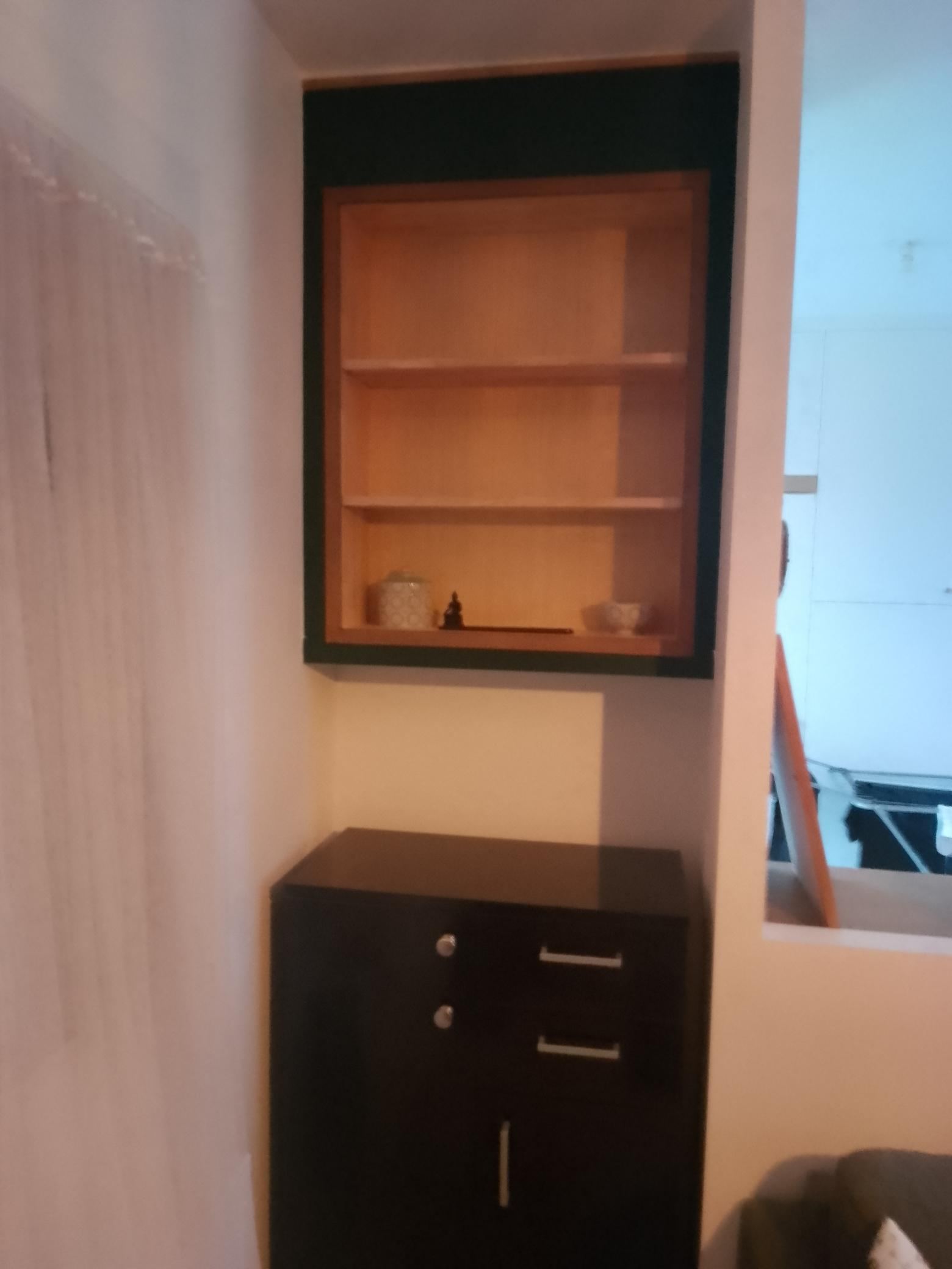Reste à finaliser avec des plateaux, je n'ai pas encore tranché à ce niveau et habiller le mur blanc d'un panneau MDF de la même couleur verte.Pour l'alcove je souhaite également réaliser un meuble bas.