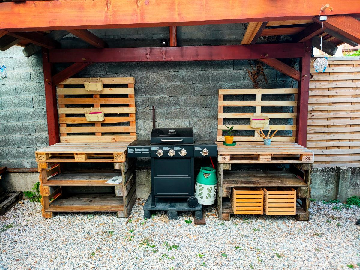 Donc à l'arrache, sans plans et sans vergogne, j'ai assemblé quelques palettes qui traînaient pour servir provisoirement de meuble de cuisine et plan de travail.