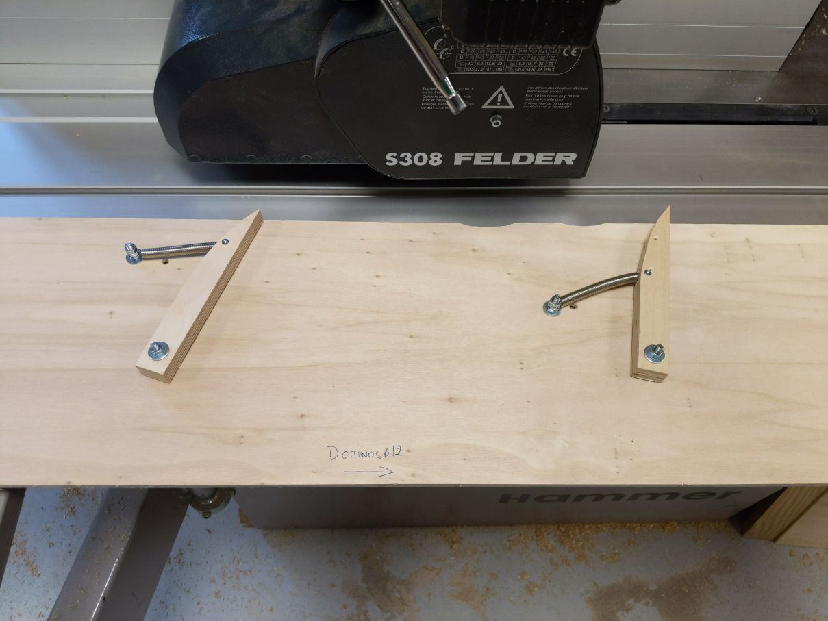 Aujourd'hui, j'ai enfin réalisé des domino à la chaine. Après avoir soigneusement calibré à la raboteuse, j'ai configuré la toupie dans le sens gauche vers droite et retourné le porte-fer.