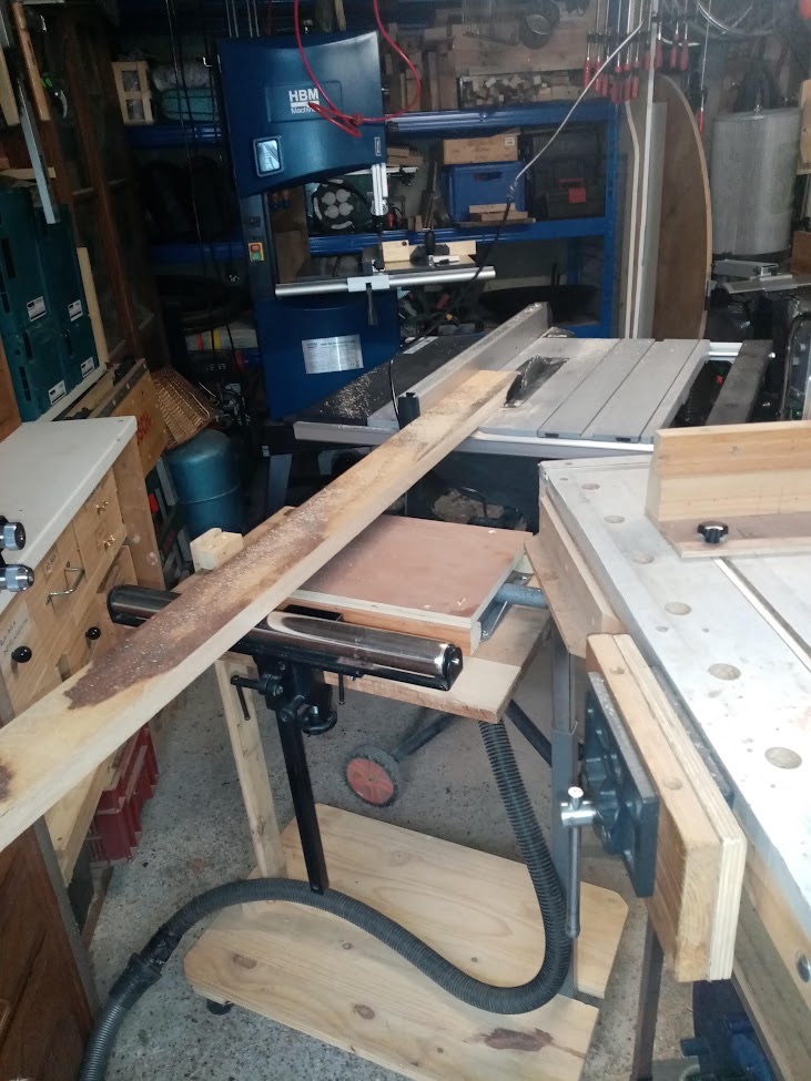 J'ai enlevé les aubiers de mes plateaux de chêne grâce à la scie sur rail, puis débité le tout à la scie sous table.