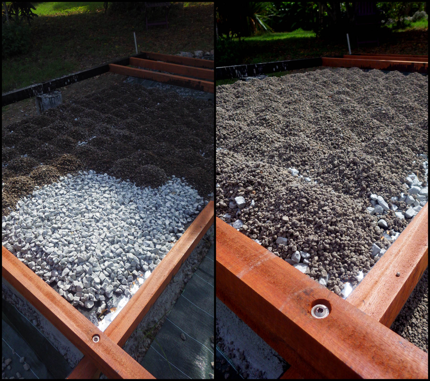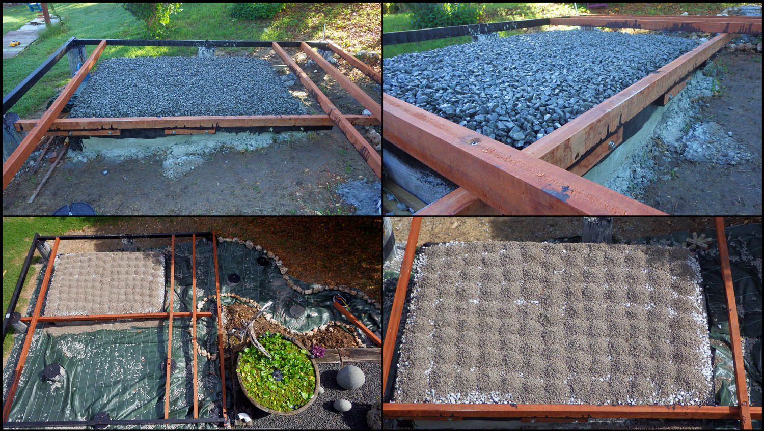 Lit de gravier : (4 seaux, 2 pots (à fleurs) de 10 de ciment)x4 et voici un tapis amortisseur réhausé de cônes de pouzzolane pour amortir le dépot de la pierrre.