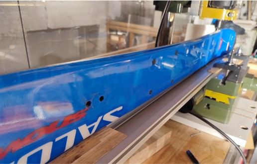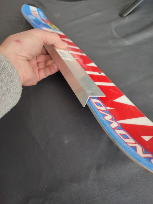 Petit reportage photo sur la confection, avec une vue d’ensemble pour commencer : 1 - le plus important : les cornières sur les skis pour améliorer la dirigeabilité.