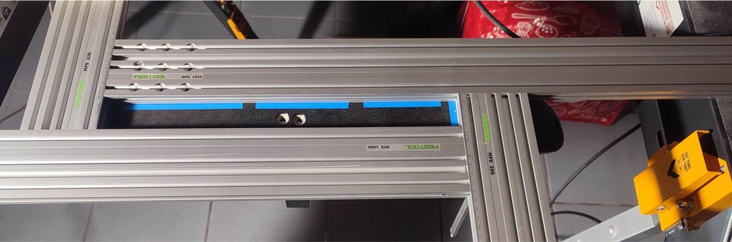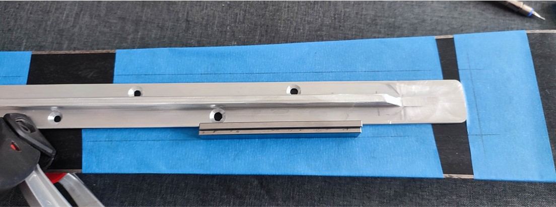 - Pour les rails centraux, j’ai pris 2 cornières de 2 mm d’épaisseur mises dos à dos, avec un plat alu supplémentaire de 2 mm d’épaisseur entre les 2, soit une largeur du rail central de 6 mm, le tout collé avec de la colle Methacrylate MMA 5013. Je les ai usinées pour une hauteur de rail de 10 mm, et une largeur de 28 mm, et en laissant le passage pour les vis de fixation aux pieds de la luge :