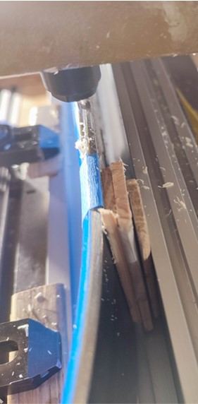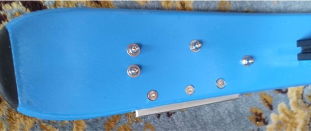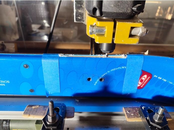 Un petit détail : les semelles ne sont pas planes. Du coup, je les fait bien coller au gabarit avec des brides en dessous : Défonçage sur 2 mm de profondeur : Le gabarit et le ski sont tout simplement posés sur tréteaux (avec la spatule, pas possible de poser sur le plan de travail de manière stable). On attaque la semelle noire qui est très fine puis une couche de fibres beiges. Aucune difficulté, si ce n'est qu'il reste des fils à la surface qu'un coup de calle à poncer fait partir sans problème: Il ne reste plus qu’à arrondir les angles, sur une lapidaire improvisée (au passage, il faudra vraiment que je m’en fabrique une plus durable, c’est vraiment un outil que je trouve très utile et très efficace, à la fois pour le bois et le métal): Au final, tout s’emboite parfaitement. Perçage des skis pour fixer par des vis inox traversantes toutes simples, têtes fraisées fendues, et rondelles et écrous borgnes sur le dessus du ski. Il faut serrer très progressivement car les rondelles ont tendance à s’enfoncer dans le ski. Et côté semelle, je positionne la fente des vis dans l’axe du ski !