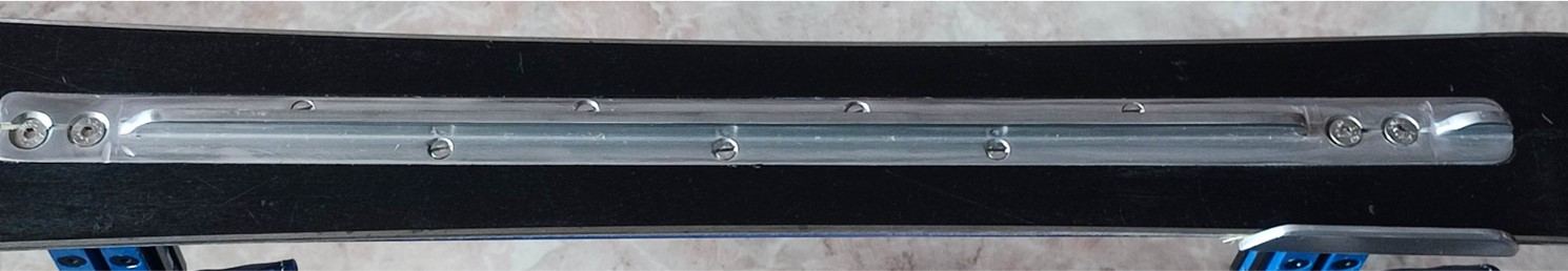 - J’ai également ajouté des morceaux de cornières supplémentaires sur le côté intérieur de l’arrière des 4 skis. Cette fois, une simple cornière de 4 mm d’épaisseur. J’ai surfacé la face supérieure pour la ramener à 2 mm d’épaisseur, afin de pouvoir le glisser dans une fente sur le bord des skis.