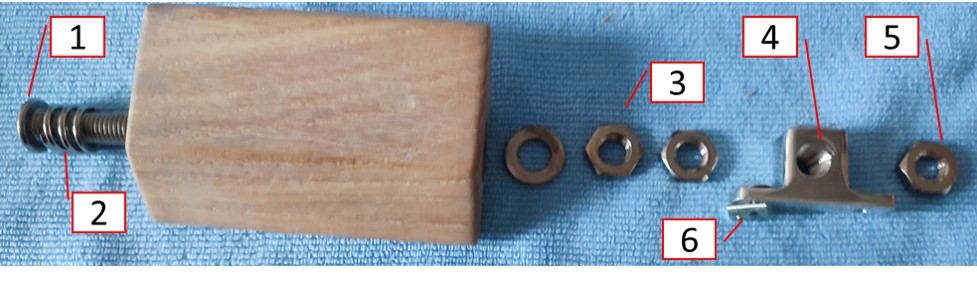 Et enfin une pièce usinée en aluminium assez basique avec un trou taraudé pour fixation au pied de la luge (4), et un dernier contre écrou pour tout serrer (5). Seul petit bémol : les fixations aux pieds (6) sont trop légères. Une a lâché (perte de la vis et du tasseau de rainure). Je referai avec des tasseaux plus longs, voire avec des vis traversant tout le pied et un écrou de l’autre côté.