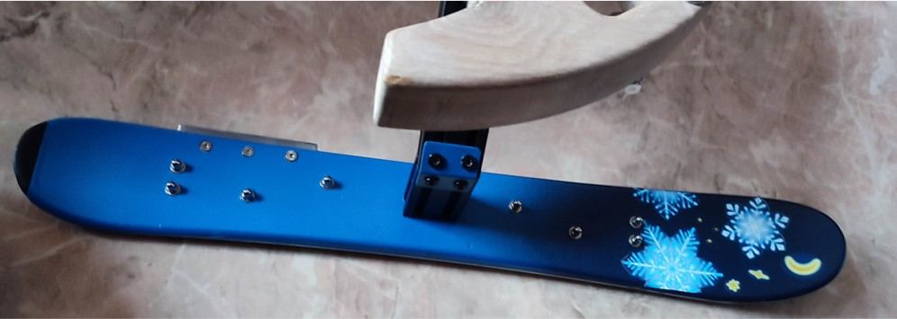 Et pour finir, j’ai poncé les skis avants, les ai repeints (à la bombe pour un dégradé de bleu), puis 5 ou 6 couches de vernis polyuréthane, et enfin quelques stickers (dessinés maison et commandés sur un site).