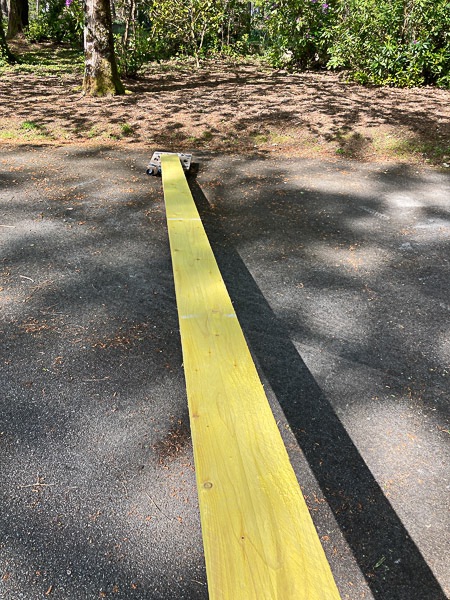 1- déplacer les 17 bastaings 185x63 en 5m sans me flinguer le dos : 2- mesure/marquage/installation de niveau/coupe -> j'ai bien fait de perdre un peu de temps à réfléchir à l'installation, j'en ai gagné 10 fois plus ensuite. Rien de bien compliqué mais il m'a fallu 2-3 essais pour trouver une solution efficace. Dont un gentil kick-back dans la version sans le deuxième support (l'échelle à gauche) -> le bastaing était en porte-à-faux à gauche et à la coupe ça a bloqué la lame par pression. Avertissement sans conséquence.