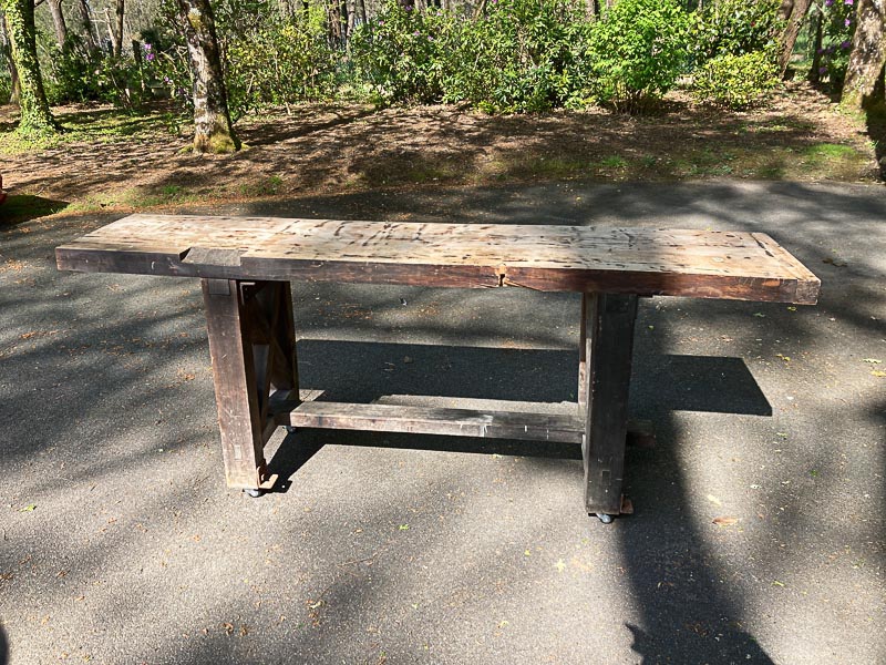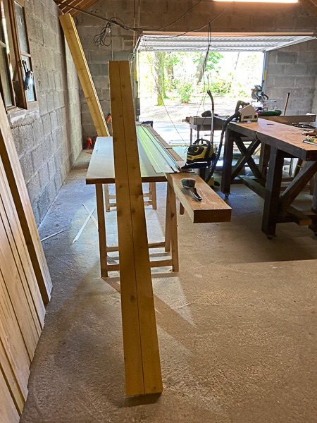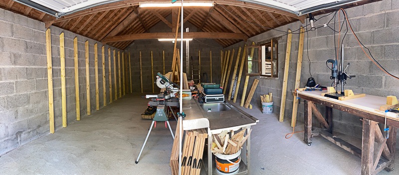 Ordre non chronologique puisque ça a été fait avant d'attaquer les coupes/refentes de bastaings. Un peu en urgence puisque la météo locale joliment estivale cette semaine tourne au franchement humide la semaine prochaine. Ça m'aurait légèrement désappointé (merci à ce cher Gary Oldman d'avoir remis ce mot à la mode) de nettoyer tout le garage, de faire une belle ossature bois pour tout voir réhumidifié avant même d'avoir fini (commencé?) le garatelier.