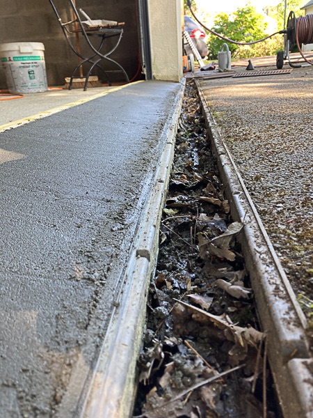 Donc du béton, de la fibre, un peu d'adjuvant, un demi-coffrage et zou : Il ne restera qu'à faire la pente symétrique côté intérieur, un petit lissage au ciment pur des 2 côtés et bien sûr, je sais, il faudra que je vide le caniveau... plus tard.