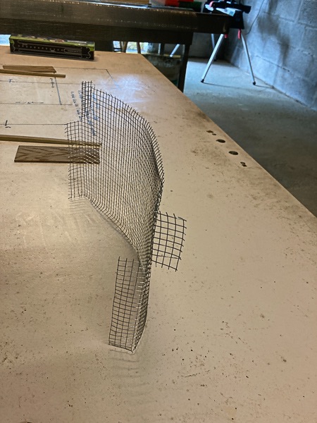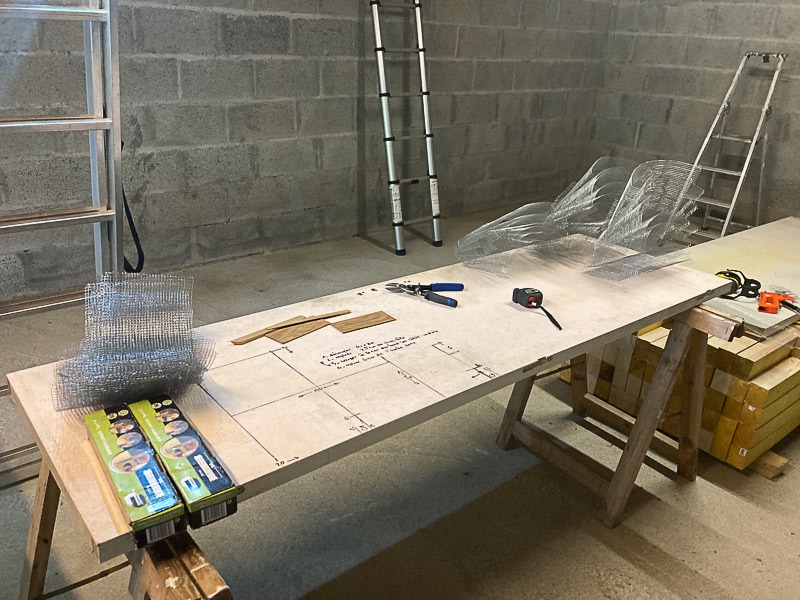 Idée (de génie?...) pour que ça reste pas trop cher : grillage à poule en maille de 6mm, découpes et production en série. Puis agrafage. Bilan : plutôt pas mal mais déjà une bonne grosse journée de perdue, évidemment.