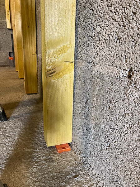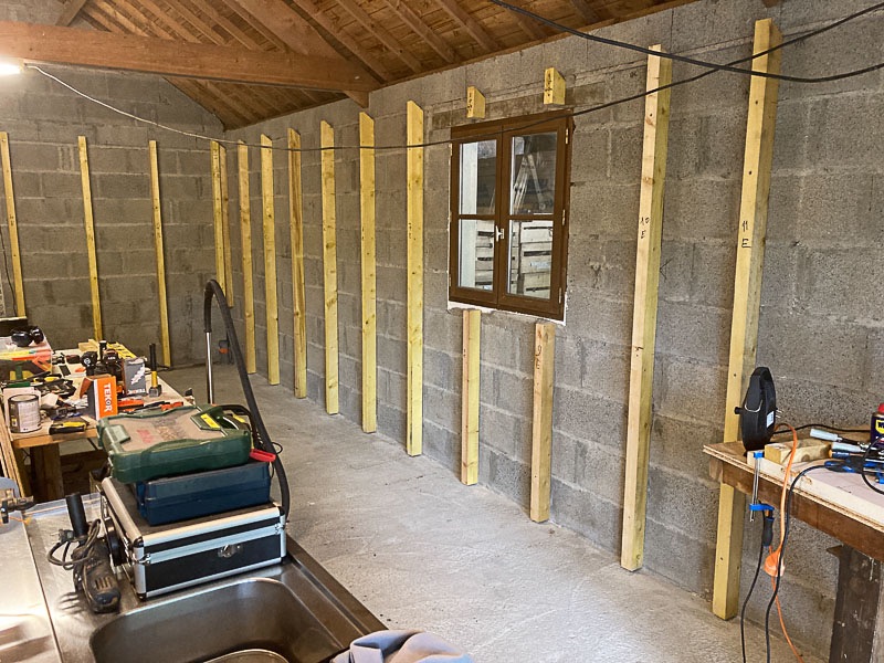 - positionner les montants par rapport à cette ligne en prévoyant mini 1 cm d'espace sous le montant pour éviter le contact avec le sol (ce sera calé avec des cales plastiques de menuiserie ensuite, comme ça pas de risque de remontée d'humidité si jamais), le bon niveau vertical et le bon entraxe de 59 cm
