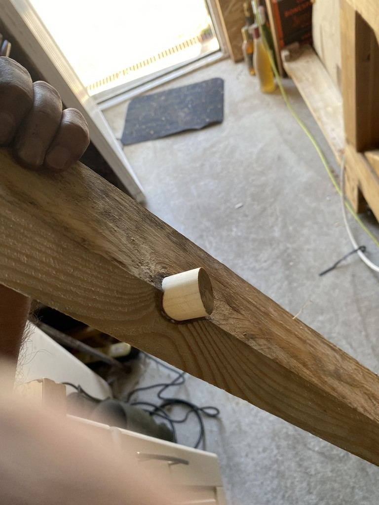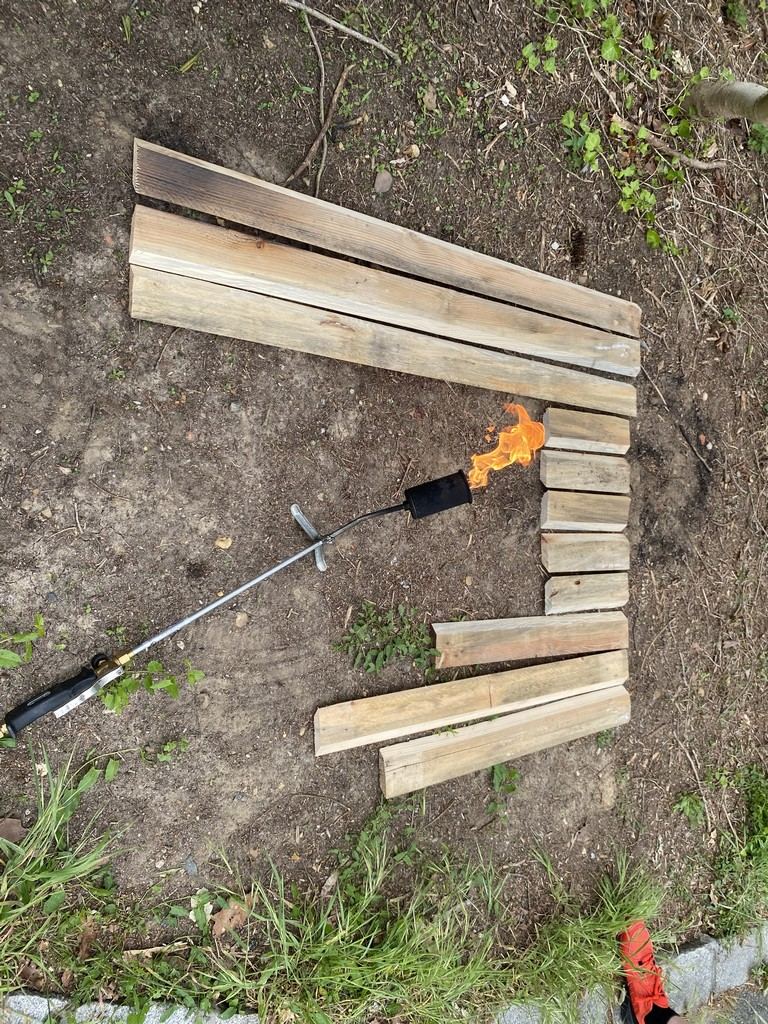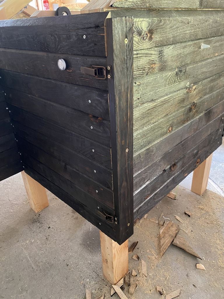 Pour la suite, j'ai réalisé le bardage en bois brulé. bouché quelques noeuds : et realisé les perçages pour le capteur de luminosité et l'indicateur d'etat de la porte :