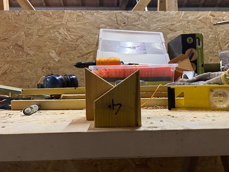 Donc, ben je laisse en stand-by pour le moment et je décide de régler le problème des supports sous la faitière. Et là, ça bidouille, on tente une v1, puis une v2, puis une v3 pour finalement aboutir à un truc pas si pire à base de chutes des montants, réglées par 2 en les faisant coulisser jusqu'à être toutes alignées sur un cordeau de référence (sans oublier l'épaisseur des plaques d'OSB 9mm qui viendront s'y fixer, ben oui la v3 était bonne mais il a fallu tout démonter et retailler de 9mm, évidemment).