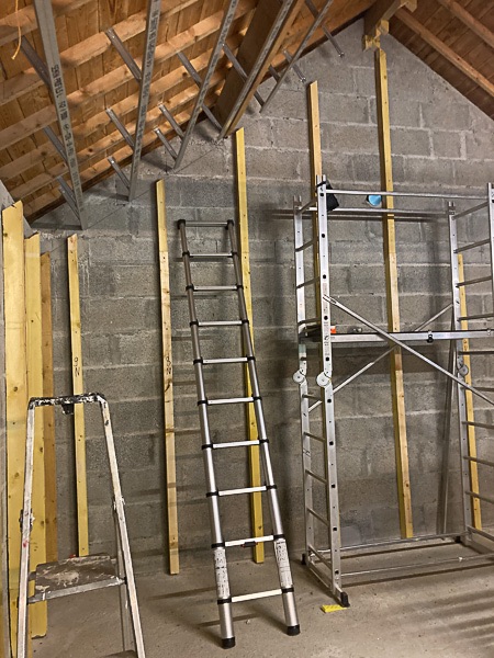 - un échafaudage. Il n'est pas bien grand, il ne me permet pas d'aller jusqu'à la faitière mais c'est quand-même bien plus confortable et sécu que de tout faire sur l'échelle (traçage/perçage/perfo/vissage/etc...). 80 cahouètes bien investies et à 20 minutes de la maison avec des vendeurs super sympas en plus (et 25 minutes à discuter rénovation sur un parking de supermarché).