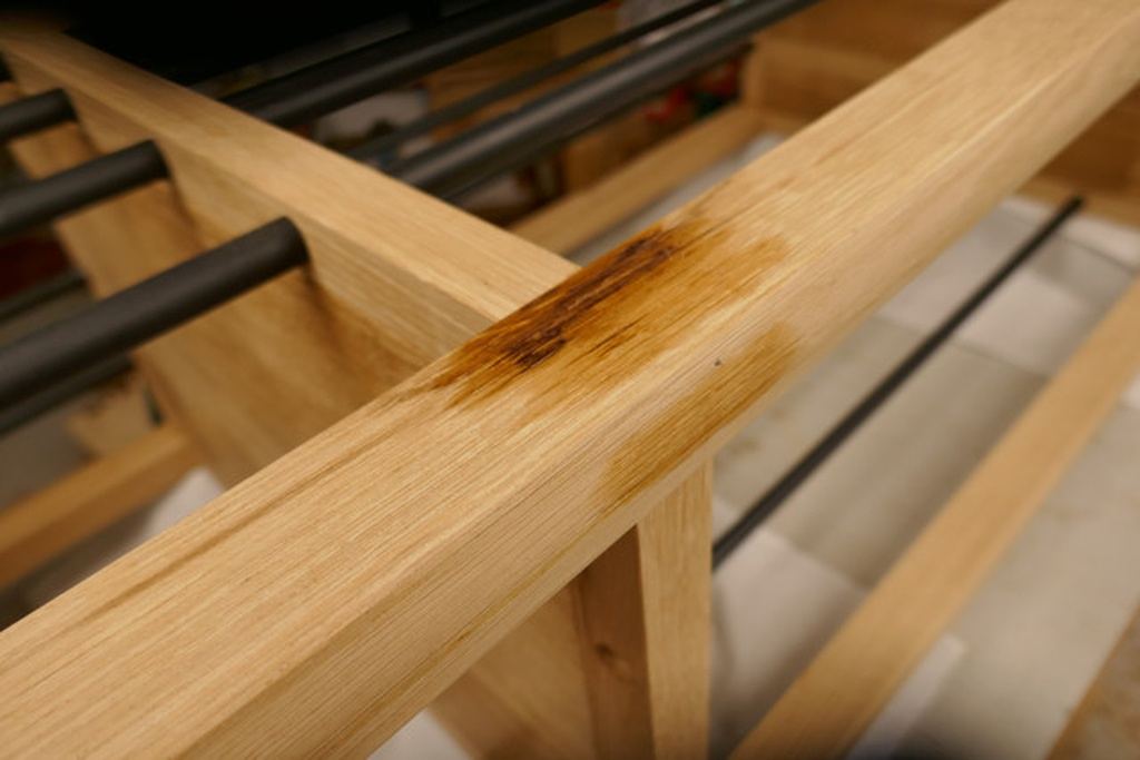 Enorme déception lors de l'essai pour la première fois de dormants parksides. Les tampons en plastique suintent un genre d'huile avec la pression et le temps. Bien entendu je ne m'en suis rendu compte que le lendemain et le bois avait eu le temps de se délecter de tout ce breuvage. Pour la 2ème session de collage j'ai au préalable tenté de tout dégraisser sans grande amélioration.