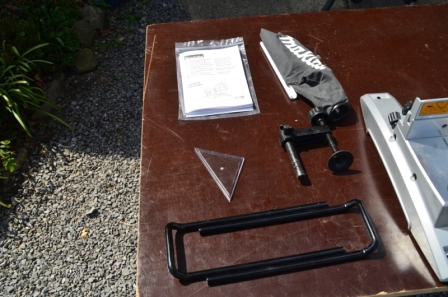 Rien exceptionnel, la machine entièrement montée, et 5 accessoires ( les deux rallonges de support, une serre de blocage, une équerre en plastique dont je n'ai pas encore trouvé l'utilité, 2 piles pour le laser, le sac d’aspiration et le mode d'emploi) Premier sentiment, cette machine est balèze... Je compte fabriquer une meuble de ce genre et les dimensions intérieures devront être de 105cm de large par 90 de profond...
