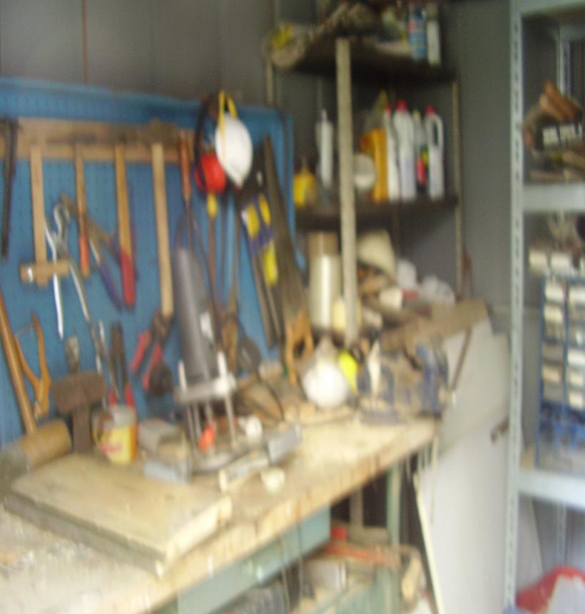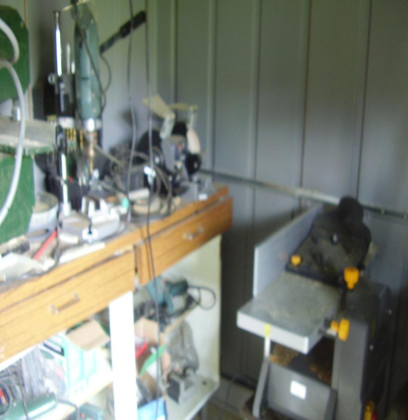 Après avoir longtemps travaillé dehors, j'ai installé mon atelier dans un abri de jardin métallique de 8m2 environ. C'est petit mais j'ai quand même réussi à y faire entrer un établi, 2 étagères, un meuble de cuisine pour le rangement des outils, une petite dégau-rabot, une scie circulaire sur table et l'indispensable poubelle.