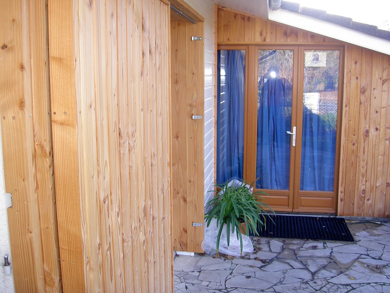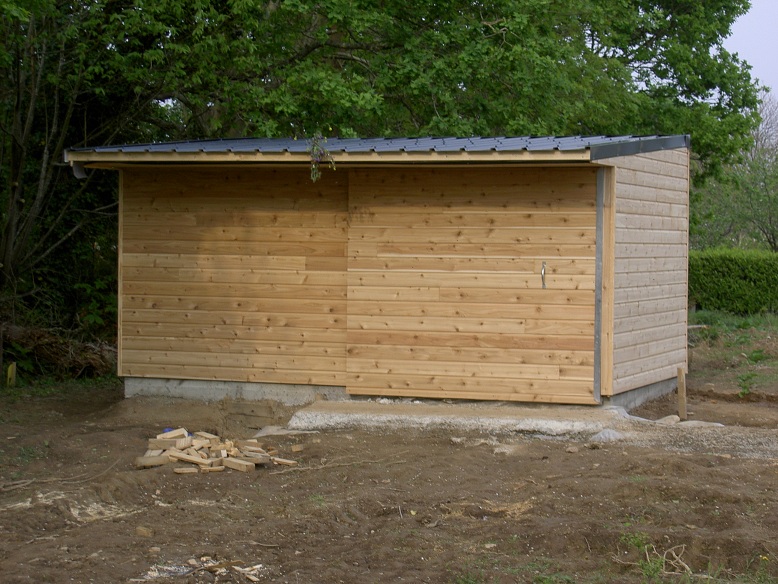 L'abri de jardin pour ma soeur. J'aime pas le bardage, mais c'était la commande... préfabriqué, transporté, puis monté et bardé sur place. Porte en chutes de douglas.