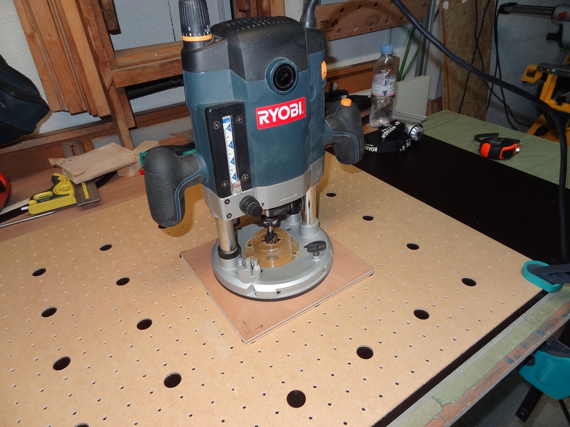La plaque de CP sur laquelle la défonceuse est fixée comporte 4 vis qui s'insère dans les trous de la plaque d'isorel.