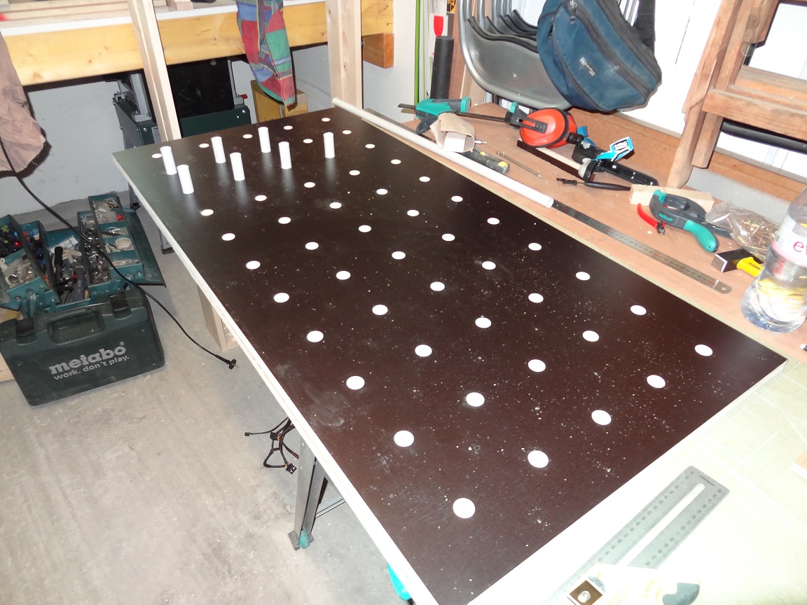 J'ai longtemps rechercher une solution pour faire un réseau de trous propre.Finalement j'ai opté pour un gabarit basé sur une plaque d'isorel perforé et un support pour la défonceuse