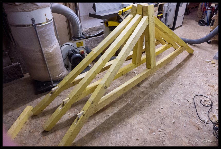 Une fois réglé l'urgence de couler les plots, j'ai attaqué la structure en chevrons de 65 x 75 mm. Première étape les p'tites fermes (j'ai un peu dérogé à certaines règles de la charpente classique, mais bon, je ne m'en veux pas