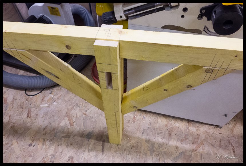 Ensuite usinage des encoches qui recevront la panne faîtière, sans oublier les mortaises pour les éléments de contreventement entre la faîtière et les poinçons :