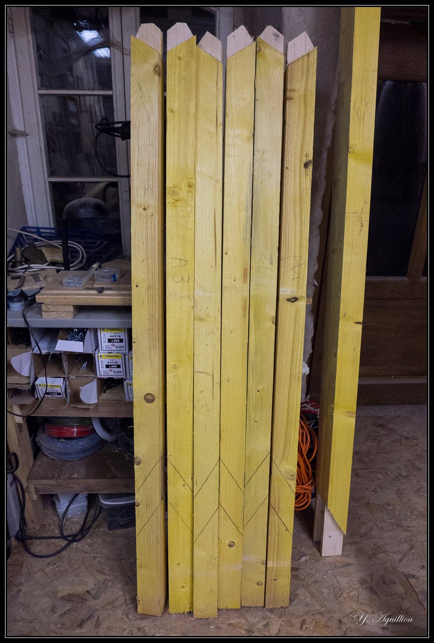 J'ai coupé les pieds avec une surlongueur qui correspond à la compensation de la pente du terrain (pente environ 10%, +12,5 cm pour les deux pieds du milieu, et +25 cm pour les deux du fond), du coup j'ai tout laissé à 2,10 mètres :