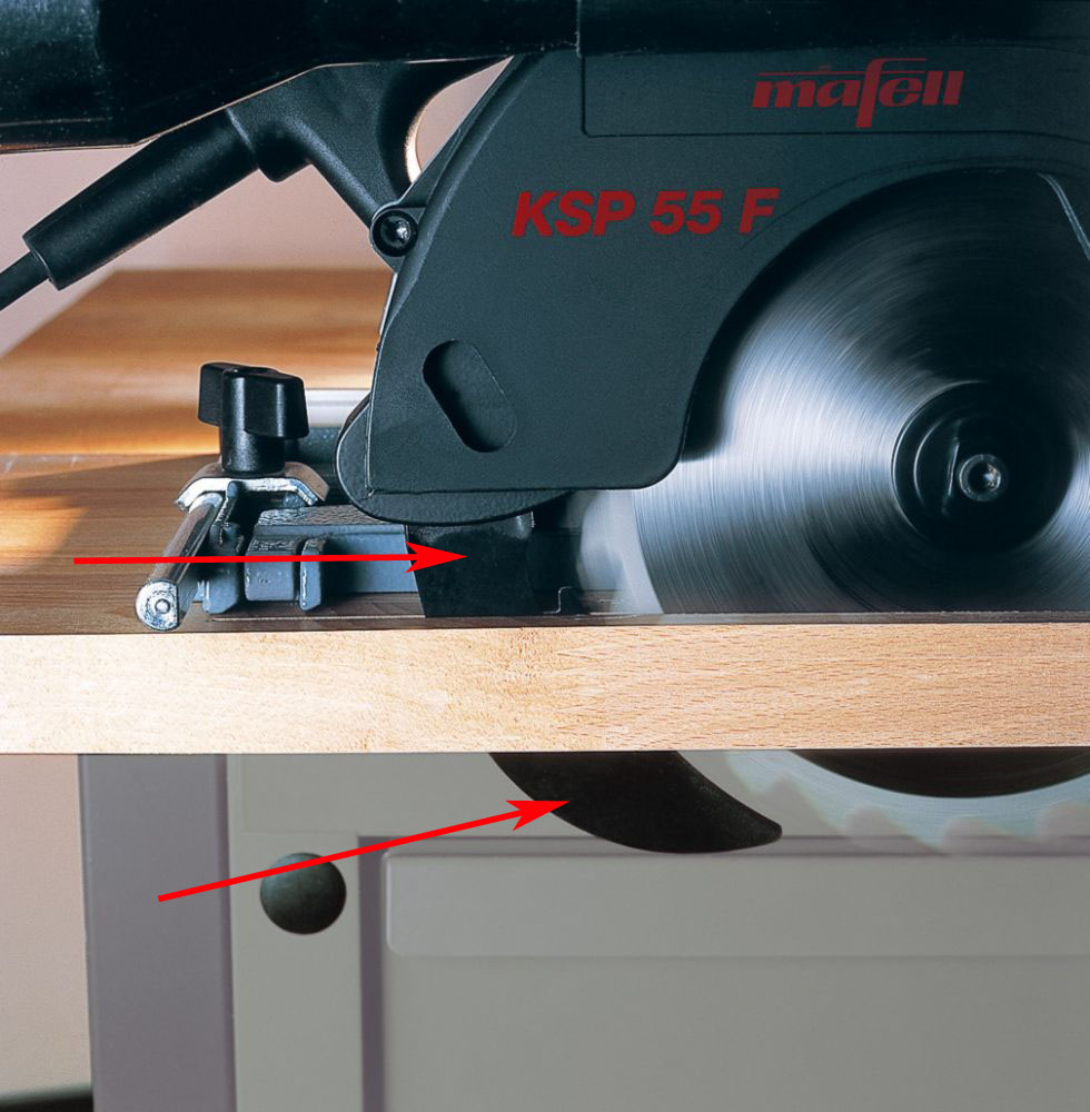Sur les scie plongeante il est soit escamotable et descend automatiquement dans la coupe, soit inexistant.