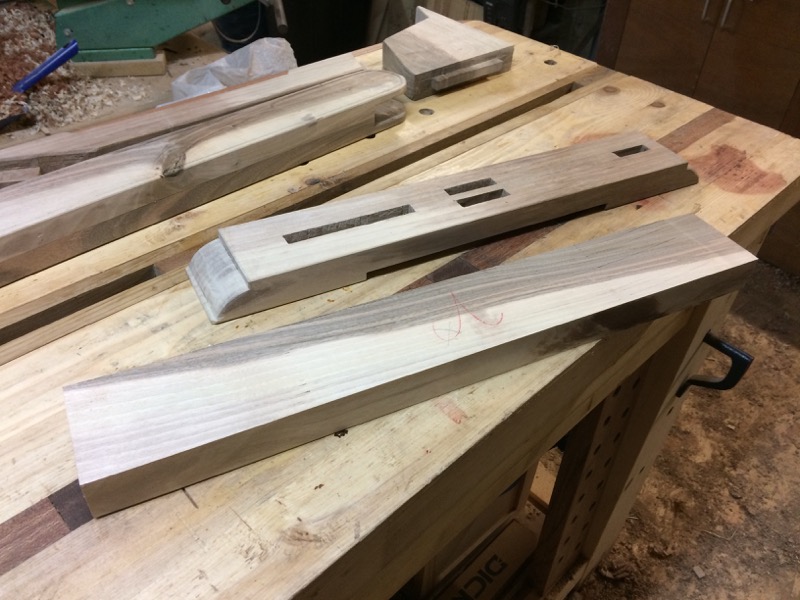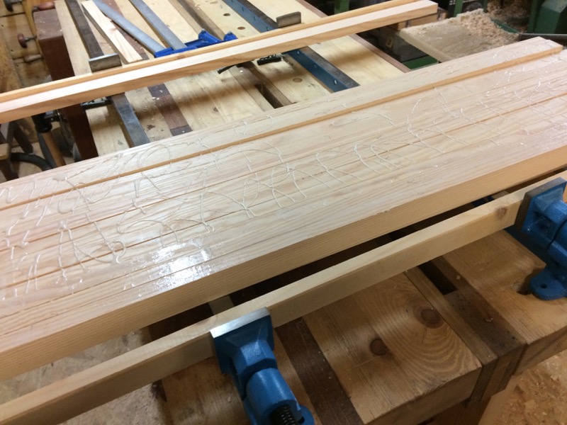 Ce dernier morceau est trop gros pour ma Kity, il faut donc le dégauchir et le mettre en forme au rabot manuel. Mais avant, je reporte touts les mesures sur la "jambe", pour pouvoir travailler dessus demain matin (24h pour le séchage définitif)