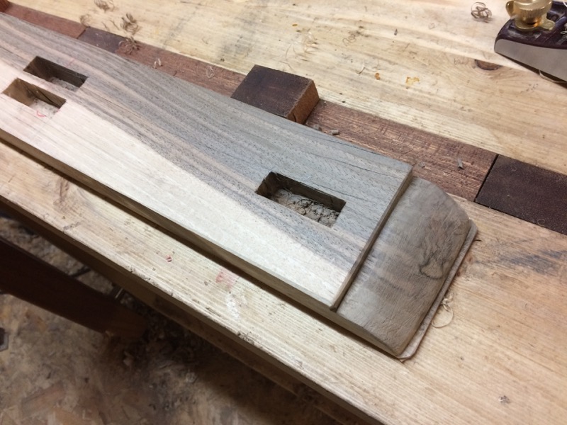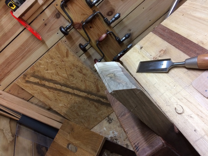 Le travail de la jambe a commencé par un petit souci : au moment de tracer le tenon double à la base de celle-ci, je me suis rendu compte que mon bois n'était pas correctement corroyé, les côtés n'étaient pas d'équerre. Je pense que le coupable est un copeau qui s'est insidieusement glissé sous mon morceau au moment du rabotage pour la mise aux dimensions. J'ai donc dû repasser par un petit dégauchissage avant de poursuivre, ce qui me fait perdre quelques mm de largeur sur la jambe. C'est mesurable, mais ça ne se verra pas à l'oeil, les deux montants n'étant ps à côté de l'autre. Par contre, il a fallu que je rabote aussi mes tenons, les mortaises ayant légèrement diminué en profondeur.