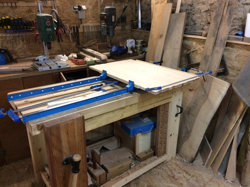 Comme tout va bien, je remets mon établi en place et c'est parti pour le collage. Pour des raisons de température, j'ai dû utiliser de la Titebond 3, mais elle comme son temps d'ouverture est de 10mn, ça n'a pas été plus mal.